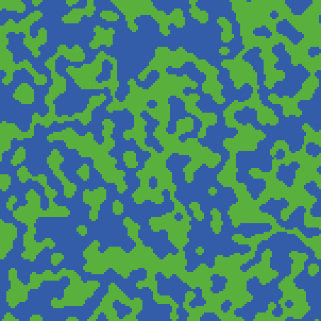 Click the SETUP button to create an approximately equal but random distribution of blue and green patches. Click GO to run the simulation.