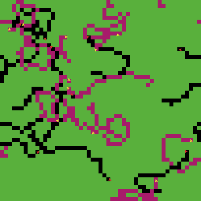 to setup clear-all crt 20 [ ;; color half the turtles red, ;; the other half yellow set color one-of [yellow red] setxy random-xcor random-ycor ] ask patches [ set pcolor green ;; color the patches green ] reset-ticks end to go ask turtles [ rt random 90 lt random 90 fd 1 ;; if you're a red turtle, turn your patch black if color = red [ set pcolor black ] ;; if you're a yellow turtle, turn your patch magenta if color = yellow [ set pcolor magenta ] ] tick end ; Public Domain: ; To the extent possible under law, Uri Wilensky has waived all ; copyright and related or neighboring rights to this model.