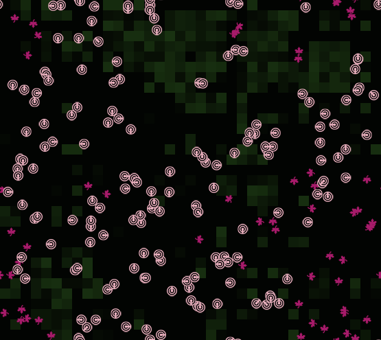 globals [ ;; variables used to assign colors and shape to clients shape-names ;; list that holds the names of the shapes a critter can have colors ;; list that holds the colors used for clients' critters color-names ;; list that holds the names of the colors used for clients' critters max-possible-codes ;; total number of possible unique shape/color combinations longevity-leader-info ;; holds user-id and if the species is not extinct, the shape and color name longevity-leader-age-and-status ;; holds age of the species and whether it is extinct or alive max-critter-lifespan ;; the max number of ticks a critter can live birth-cost ;; the amount of energy needed to give birth dt ;; a time scaling unit used in the simulation to adjust how quickly events are rendered. player-spam-countdown ;; the number of ticks a player must wait before placing a new species #-environment-changes ;; the number of times the environment has changed events ;; a string holding a description of all the automatic environment changes that occurred in grass growth and max-grass total-species-created ;; the total number of species created max-species-age ;; the maximum age of all species created ] breed [ clients client] ;; one for each client that logs in, for book-keeping breed [ species-logs species-log ] ;; one for each client, that logs in. It keeps track of all the species that have been created and tested by the client. breed [ critters critter ] ;; all the creatures in the ecosystem clients-own [ user-id ;; unique id, input by the client when they log in, to identify each client turtle ; we have to keep track of the values from the client interface, whenever they change ; although we do not pass them on to critters they have already created. gray-out-others? ;; if false, only this client's critters will be colored show-energy? ;; if true, display the energy level for each individual critter of this client's species placing-spam-countdown ;; the number of ticks this client must wait before placing a new species placements-made ;; the number of species this client has placed population-size ;; the number of critters this client has current-longevity ;; the age of this client's current species max-longevity ;; the age of the oldest species this client has created speed ;; how fast this client's critters move behavior-dna ;; the pattern of steps that this client's critters move in birthing-level ;; the energy level each individual must reach before reproducing as well as ;; how much energy is split between the parent and the offspring when this occurs carnivore? ;; if true, this client's species can eat other critters ] critters-own [ age ;; the number of ticks this critter has been alive for energy ;; this critter's energy level creator-id ;; number to identify the creator of this critter species-id ;; number to identify this species ;;these variables are similar to the variables in clients-own with the same name speed behavior-dna birthing-level carnivore? current-action ;; this critter's current action from their behavior-dna action-index ;; the list index of this critter's current action in their behavior-dna movement-counter ;; a counter that ticks down for a certain number of tics for each action in the ;; critters movement. This allows the participants to be able to see the critters turning ;; and sliding forward or backward fluidly. movement-delta ;; the distance the critter moves species-start-tick ;; the time (number of ticks) when this critter was made ] species-logs-own [ creator-id ;; number to identify the creator of this species species-id ;; number to identify this species age ;; the number of ticks this species has been alive for created-on ;; the time (number of ticks) when this species was made last-alive-on ;; the time (number of ticks) when this species was last alive extinct? ;; if true, this species is no longer alive ] patches-own [ sugar ;; the amount of nutrients available on a patch ] ;;;;;;;;;;;;;;;;;;;;;;;;;;;;;;;;;;;;;;;;;;;; ;; Setup Procedures ;;;;;;;;;;;;;;;;;;;;;;;; ;;;;;;;;;;;;;;;;;;;;;;;;;;;;;;;;;;;;;;;;;;;; to startup hubnet-set-client-interface "COMPUTER" [] hubnet-reset setup-vars end to reset-client-stats set placements-made 0 set population-size 0 set current-longevity 0 set max-longevity 0 end to setup clear-patches clear-all-plots clear-output ask clients [ reset-client-stats ] ask critters [ die ] ask species-logs [die] reset-ticks setup-patches repeat minimum-random-species [ add-random-critter ] set longevity-leader-info "-----" set longevity-leader-age-and-status "-----" set max-critter-lifespan 1000 set birth-cost .15 set dt .5 set player-spam-countdown 25 set events [] set #-environment-changes 0 set total-species-created 0 set max-species-age 0 end to setup-patches ask patches [ set sugar random (max-grass / 5) recolor-patch ] end to add-random-critter create-critters 1 [ randomize-critter initialize-critter let shape-color-code unused-shape-color-code set-shape-and-color-by-code shape-color-code set creator-id first-unused-bot-name set energy birthing-level * 0.75 make-a-species-log ] end to make-a-species-log set total-species-created total-species-created + 1 set species-id total-species-created hatch 1 [ set breed species-logs set hidden? true set created-on ticks set last-alive-on ticks set extinct? false ] end ;; just for random bot critters to randomize-critter set speed (1 + random 10) / 10 set birthing-level (5 + random 46) set behavior-dna reduce [word ?1 ?2] n-values 30 [random-action-letter] set carnivore? (random 100 < 20) ; 20% chance of being a carnivore end ;; initialization actions that are common to bot & player-controlled critters to initialize-critter let empty-patches patches with [ not any? critters-here ] ifelse (any? empty-patches) [ move-to one-of empty-patches ] [ setxy random-xcor random-ycor ] set heading one-of [ 0 90 180 270 ] set age 0 set species-start-tick ticks set movement-counter 0 set action-index -1 if (carnivore?) [ set size 
