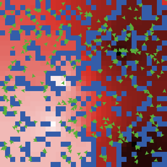 ( word "Green turtles move downhill (from white to black), avoiding blue walls "