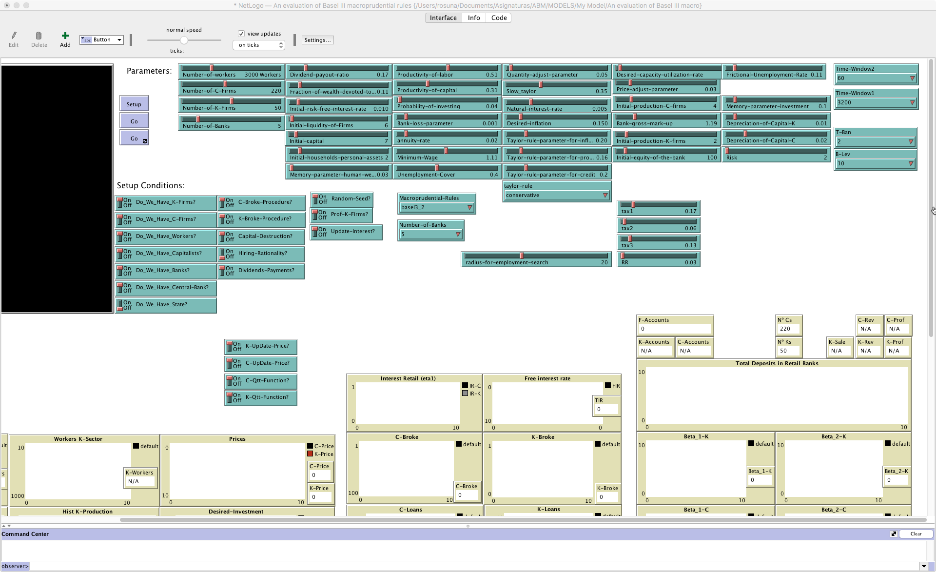 ; Macro Agent Base Model (MABM) ; code written by Rubén Osuna, from the model of Assenza, Gatti, Grazzini et al. (2015) macro ABM (as coded by Elder Silva) extensions [ matrix r stats ] ; calling the R extension and the matrix extension globals [ taylor-interest-rate ; the interest rate. Conservative type: only inflation considered. Dual mandate: inflation and output gap. Three mandate: inflation, output gap and credit eta1 ; undifferentiated interest rate applied to loans of firms with the retail banks eta2 ; interest rate applied to loans of retail banks with the Central Bank eta3 ; interest rate applied to deposits of firms in the accounts of the retail banks eta4 ; interest rate applied to deposits of retail banks in the accounts of the Central Bank GDP ; sum of consumption, total-investment and public expenditures GDP_1 ; GDP of the last period (tick) P_GDP ; potential GDP Growth-Rate ; growth rate of the GDP Recession-lenght ; how many periods the GDP is decreasing Unemployment-Rate ; rate of unemployment Total-Consumption ; sum of goods sold by the consumptions firms Total-Investment ; sum of total capital sold by the capital production firms Goods-Price-Level ; sum (price * qt) / Qt sold Goods-Price-Level_1 ; the same, for the previous period Capital-Price-Level ; sum (price * qt) / Qt sold Capital-Price-Level_1 ; the same, for the previous period Total-Loans-Firms ; sum of loans of retail banks with firms of any kind Total-Loans-C-Firms ; sum of loans with the C-Firms Total-Loans-K-Firms ; sum of loans with the K-Firms Total-Central-Bank-Loans ; sum of loans of the retail banks with the Central Bank Total-Loans ; sum of loans in this economy (adding up the previous cathegories) Total-Loans_1 ; sum of loans in this economy for the previous period Total-Client-Loans ; this variable should be equal to Total-Loans, but calculated from banks' variables Total-Deposits ; sum of all deposits of the retail banks Total-Clients-Accounts ; this variable should be equal to Total-Deposits, but calculated from banks' variables Total-Deposits_1 ; sum of all deposits of the retail banks, previous period Total-Reserves ; sum of all reserves of the retail banks Total-Deposits-Workers ; sum of deposit at the bank of the households Total-Deposits-Capitalists ; sum of deposit at the bank of the capitalists Total-Deposits-C-Firms ; sum of deposit at the bank of the C-Firms Total-Deposits-K-Firms ; sum of deposit at the bank of the K-Firms Total-Interest-Payments ; sum of all interest payments from loaners to retail banks Total-Installment-Payments ; sum of all installment payments from loaners to retail banks C-Firms ; group of firms producing consumption goods K-Firms ; group of firms producing capital goods Workers ; group of households that offer work time Capitalists ; group of households that are owners of firms and banks and do not work for others Employed ; group of workers with an employment Unemployed ; group of workers without an employment C-Broke ; number of consumption firms that went broken last period K-Broke ; number of capital production firms that went broken last period B-Broke ; number of banks that went broken last period Matrix-C-Firms-Bankruptcy ; input with information that will be used in calculation into R (eq 23) Matrix-K-Firms-Bankruptcy ; input with information that will be used in calculation into R (eq 23) Matrix-Basel-Buffer ; input with information that will be used in calculation into R (eq 23) cpi ; consumer price index of this period cpi_1 ; consumer price index of the previous period inflation ; inflation of this period inflation_1 ; inflation of the previous period Wage-on-GDP ; total salaries as a percentage of the GDP, then wage = Wage-on-GDP * GDP / Number-of-Employees is the wage that keeps that proportion constant Wage-on-GDP_1 ; total salaries as a percentage of the GDP, then wage = Wage-on-GDP * GDP / Number-of-Employees is the wage that keeps that proportion constant Credit-on-GDP ; this is the basic ratio used in the Counter-Cyclical-Capital-Buffer defined in Basel III rules Credit-on-GDP_1 ; the same from the previous period Credit-on-GDP-Gap ; difference between current Credit-on-GDP and the long run trend State-budget ; how much money the Government owns at this stick State-budget_1 ; how much money the Government had the previous period. It is related to the cycle Leverage-Banks ; mean leverage of the Banks, the Central Bank has their numbers Central-Bank-Own-Capital ; the own capital of the central bank, a liability in its balance Account-of-State-at-Central-Bank ; Account of the State at the Central Bank Monetary-Base ; currency plus total reserves or public debt plus credits o the central bank to retail bank less Account-of-State-at-Central-Bank and the capital of the CB Currency ; bills and coins, the monetary base less total reserves Money-Supply ; menetary base multiplied by the money multiplier, which is the inverse of RR, the reserve ratio Capital-Buffer ; a % of the new loans acting like reserves QEasing? ; it is automatically set true if three periods of recession are observed PublicDebt ; public debt titles sold to the central bank PublicDebt_1 ; public debt titles sold to the central bank the previous period Wage ; uniform wage paid to the workers by C-Firms and K-Firms Wage_1 ; wage of the previous period Helped-Households ; how many households are being helped Beta_1-C-Firms ; parameter utilized by the banks to calculate the interest rate for the firms (eq 26) Beta_2-C-Firms ; parameter utilized by the banks to calculate the interest rate for the firms (eq 26) Beta_1-K-Firms ; parameter utilized by the banks to calculate the interest rate for the firms (eq 26) Beta_2-K-Firms ; parameter utilized by the banks to calculate the interest rate for the firms (eq 26) Mjc ; parameter utilized in the process "SubF-Call-Matrix-formation", related to C-Firms Mjk ; parameter utilized in the process "SubF-Call-Matrix-formation", related to K-Firms M