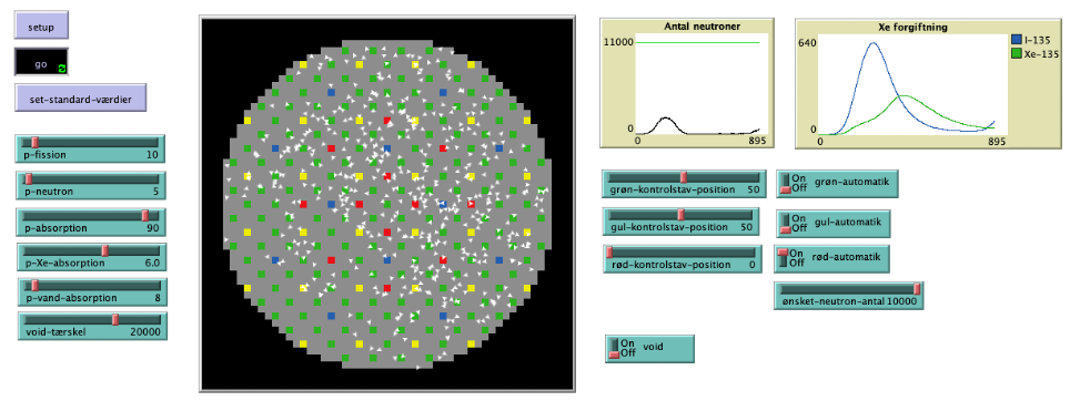 patches-own [I-135 Xe-135] globals [integral prev-err dt] to setup clear-all ask patches [ if distancexy 0 0 < 24 [ set pcolor gray ] if distancexy 0 0 < 16 [ if pxcor mod 8 = 4 and pycor = 0 and pcolor = gray [ set pcolor red ] if pxcor = 0 and pycor mod 8 = 4 and pcolor = gray [ set pcolor red ] if pxcor mod 16 = 8 and pycor mod 16 = 8 and pcolor = gray [ set pcolor red ] ] if pxcor mod 16 = 8 and pycor mod 16 = 0 and pcolor = gray [ set pcolor blue ] if pxcor mod 16 = 0 and pycor mod 16 = 8 and pcolor = gray [ set pcolor blue ] if pxcor mod 8 = 4 and pycor mod 8 = 4 and pcolor = gray [ set pcolor yellow ] if pxcor mod 4 = 0 and pycor mod 4 = 0 and pcolor = gray [ set pcolor green ] if pxcor mod 4 = 2 and pycor mod 4 = 2 and pcolor = gray [ set pcolor green ] set I-135 0 set Xe-135 0 ] set prev-err 0 set dt 1 ;h reset-ticks end to set-standard-værdier set p-fission 10 set p-neutron 5 set p-absorption 90 set p-Xe-absorption 6 set p-vand-absorption 8 set grøn-kontrolstav-position 50 set gul-kontrolstav-position 50 set rød-kontrolstav-position 50 set grøn-automatik false set gul-automatik false set rød-automatik true set void false set void-tærskel 20000 end to go ; automatik if ønsket-neutron-antal = 0 [ set ønsket-neutron-antal 1 ] let err count turtles - ønsket-neutron-antal set integral integral + err let differential err - prev-err set prev-err err if rød-automatik = true [ set rød-kontrolstav-position round( 50 / ønsket-neutron-antal * err + 0.00005 * integral + 0.05 * differential) + 50 if rød-kontrolstav-position < 0 [ set rød-kontrolstav-position 0 ] if rød-kontrolstav-position > 100 [ set rød-kontrolstav-position 100 ] ] if gul-automatik = true [ set gul-kontrolstav-position round( 50 / ønsket-neutron-antal * err + 0.00005 * integral + 0.05 * differential) + 50 if gul-kontrolstav-position < 0 [ set gul-kontrolstav-position 0 ] if gul-kontrolstav-position > 100 [ set gul-kontrolstav-position 100 ] ] if grøn-automatik = true [ set grøn-kontrolstav-position round( 50 / ønsket-neutron-antal * err + 0.00005 * integral + 0.05 * differential) + 50 if grøn-kontrolstav-position < 0 [ set grøn-kontrolstav-position 0 ] if grøn-kontrolstav-position > 100 [ set grøn-kontrolstav-position 100 ] ] ; neutronkilde ask patches with [pcolor = blue] [ if random 100 < p-neutron [ sprout 1 [ set color white set heading random 360 ] ] ] ; Xe-135 henfald i brænselsstave ask patches with [pcolor = gray] [ set Xe-135 Xe-135 * (1 - 0.0076 * dt) ] ; I-135 henfald i brænselsstave ask patches with [pcolor = gray] [ let d-I-135 I-135 * 0.0105 * dt set I-135 I-135 - d-I-135 set Xe-135 Xe-135 + d-I-135 ] ; brændselsstav let n-Xe sum [Xe-135] of patches ask patches with [pcolor = gray] [ ask turtles-here [ ; fission if random 100 < p-fission [ ; skab nye neutroner hatch 2 [ ;Antal??? set color white set heading random 360 ] ; Skab I-135 (6% af fisionsprodukterne biver til I-135) set I-135 I-135 + .06 ] ; Absorption pga. Xe-135 (Xe-forgiftning) if random 10000 < n-Xe * p-Xe-absorption [ set Xe-135 Xe-135 - 1 ; Burn-off if Xe-135 < 0 [ set Xe-135 0 ] die ] ; Absorption pga. kølevand / void (når der er mange neutroner fordamper kølevandet) if (void = false or count turtles < void-tærskel) and random 100 < p-vand-absorption [ die ] ] ] ;kontrolstave ask patches with [pcolor = green] [ ask turtles-here [ if random 100 < p-absorption * grøn-kontrolstav-position / 100 [ die ] ] ] ask patches with [pcolor = yellow] [ ask turtles-here [ if random 100 < p-absorption * gul-kontrolstav-position / 100 [ die ] ] ] ask patches with [pcolor = red] [ ask turtles-here [ if random 100 < p-absorption * rød-kontrolstav-position / 100 [ die ] ] ] ask turtles [ if not can-move? 1 [die] fd 1 ] ask patches with [pcolor = black] [ ask turtles-here [ die ] ] tick end