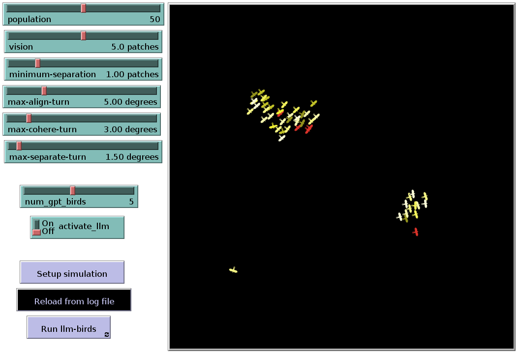 ;; VoidsGPT: Modelling Bird flocking with Generative AI ;; Author: Cristian Jimenez Romero - CY Cergy Paris University - 2025 ;;;;;;;;;;;;;;;;;;;;;;;;;;;;;;;;;;;;;;;;;;;;;;;;;;;;;;;;;;;;;;;;;;;;;; extensions [ py ] globals [ is-stopped? ; flag to specify if the model is stopped food_collected step_added_distance step_added_heading overall_distances overall_headings activate_llm ] breed [birds bird] birds-own [ flockmates ;; agentset of nearby turtles nearest-neighbor ;; closest one of our flockmates neighbors-text myheading flockmates-list bird-id action-new_heading action-status-ok action-status-code recovered_heading ] to setup_birds clear-all set activate_llm true random-seed read-from-string used_seed set step_added_distance 0 set step_added_heading 0 set overall_distances 0 set overall_headings 0 create-birds 50 [ set bird-id who set size 2; set color yellow - 2 + random 7 ;; random shades look nice setxy random-xcor random-ycor set flockmates no-turtles set neighbors-text "no neighbors in vision radius" set myheading heading set shape "hawk" ] reset-ticks end to go_birds ;; forever button let max-separate-turn-text (word "max_separate_turn_text = '" precision (max-separate-turn) 2 "'") py:run max-separate-turn-text let max-align-turn-text (word "max_align_turn_text = '" precision (max-align-turn) 2 "'") py:run max-align-turn-text let max-cohere-turn-text (word "max_cohere_turn_text = '" precision (max-cohere-turn) 2 "'") py:run max-cohere-turn-text let minimum-separation-text (word "minimum_separation_text = '" precision (minimum-separation) 2 "'") py:run minimum-separation-text let step_text ( word "step: " ticks ) print step_text ask birds [ ifelse bird-id < num_gpt_birds [ set color red sense-world ifelse activate_llm [ run_llm ][ set heading recovered_heading ] ] [ flock ] ] repeat 5 [ ask turtles [ fd 0.2 ] display ] print "end step" with-local-randomness [ calculate-differences ] tick end to flock find-flockmates if any? flockmates [ find-nearest-neighbor ifelse distance nearest-neighbor < minimum-separation [ separate ] [ align cohere ] ] end ;;; SEPARATE to separate ;; turtle procedure turn-away ([heading] of nearest-neighbor) max-separate-turn end ;;; ALIGN to align ;; turtle procedure if bird-id <= 0 [ print ( word "Align: " average-flockmate-heading ) ] turn-towards average-flockmate-heading max-align-turn end to-report average-flockmate-heading ;; turtle procedure ;; We can't just average the heading variables here. ;; For example, the average of 1 and 359 should be 0, ;; not 180. So we have to use trigonometry. let x-component sum [dx] of flockmates let y-component sum [dy] of flockmates ifelse x-component = 0 and y-component = 0 [ report heading ] [ report atan x-component y-component ] end ;;; COHERE to cohere turn-towards average-heading-towards-flockmates max-cohere-turn end to-report average-heading-towards-flockmates ;; turtle procedure ;; "towards myself" gives us the heading from the other turtle ;; to me, but we want the heading from me to the other turtle, ;; so we add 180 let x-component mean [sin (towards myself + 180)] of flockmates let y-component mean [cos (towards myself + 180)] of flockmates ifelse x-component = 0 and y-component = 0 [ report heading ] [ report atan x-component y-component ] end ;;; HELPER PROCEDURES to turn-towards [new-heading max-turn] ;; turtle procedure turn-at-most (subtract-headings new-heading heading) max-turn end to turn-away [new-heading max-turn] ;; turtle procedure turn-at-most (subtract-headings heading new-heading) max-turn end ;; turn right by "turn" degrees (or left if "turn" is negative), ;; but never turn more than "max-turn" degrees to turn-at-most [turn max-turn] ;; turtle procedure ifelse abs turn > max-turn [ ifelse turn > 0 [ rt max-turn ] [ lt max-turn ] ] [ rt turn ] end to find-flockmates ;; turtle procedure set flockmates other turtles in-radius vision end to find-nearest-neighbor ;; turtle procedure set nearest-neighbor min-one-of flockmates [distance myself] end to find-flockmates-llm ;; turtle procedure set flockmates other turtles in-radius vision set flockmates-list [] let my-x xcor let my-y ycor if any? flockmates [ ask flockmates [ let relative-x (xcor - my-x) let relative-y (ycor - my-y) let flockmate-data (list heading relative-x relative-y) ask myself [ set flockmates-list lput flockmate-data flockmates-list ] ] ] end to find-flockmates-llm2 ;; turtle procedure set flockmates other turtles in-radius vision set flockmates-list [] let my-x xcor let my-y ycor if any? flockmates [ ; Create a list of flockmates with distance information let flockmates-with-distance [] ask flockmates [ let distance-to-me distance myself set flockmates-with-distance lput (list self distance-to-me) flockmates-with-distance ] ; Sort flockmates by distance (ascending) let sorted-flockmates flockmates-with-distance let num-flockmates length sorted-flockmates ; Perform bubble sort to sort the list by distance without using `?` let swapped true while [swapped] [ set swapped false let i 0 while [i < (num-flockmates - 1)] [ let current-data item i sorted-flockmates let next-data item (i + 1) sorted-flockmates let current-distance item 1 current-data let next-distance item 1 next-data if (current-distance > next-distance) [ ; Swap the current and next elements set sorted-flockmates replace-item i sorted-flockmates next-data set sorted-flockmates replace-item (i + 1) sorted-flockmates current-data set swapped true ] set i i + 1 ] ] ; Select the closest 8 flockmates (or fewer if there aren't that many) let closest-flockmates n-of (min list 8 num-flockmates) sorted-flockmates ; Update the flockmates-list with relative positions of closest flockmates let closest-count length closest-flockmates let j 0 repeat closest-count [ let flockmate-data item j closest-flockmates let flockmate-agent item 0 flockmate-data let relative-x ([xcor] of flockmate-agent - my-x) let relative-y ([ycor] of flockmate-agent - my-y) let flockmate-info (list [h