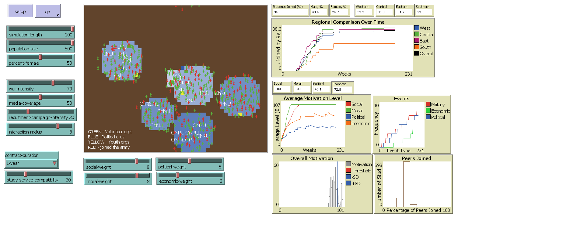 Adjust the motivation weights (currently set to Social: 8, Moral: 8, Political: 5, Economic: 3) to see which types of motivation have the strongest effect on joining decisions. Try reversing the weights to see if economic factors could become more influential under different conditions.